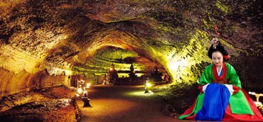 Weiter geht es zur Manjanggul-Höhle, die ebenfalls ein Naturdenkmal ist. Der rund 1 km lange Röhrentunnel wurde von auskühlender Lava gebildet und bietet heute Fledermäusen und seltenen Höhlenbewohnern ein Zuhause, bei fast konstanten 11 bis 21 Grad Celsius. 70 cm lange Lava-Stalagmiten und eine farbige Ausleuchtung machen die Manjanggul-Höhle zu einem Erlebnis, wie auch die Lavaformation „Steinschildkröte, die die gleiche Form wie die Insel Jeju-do hat.
